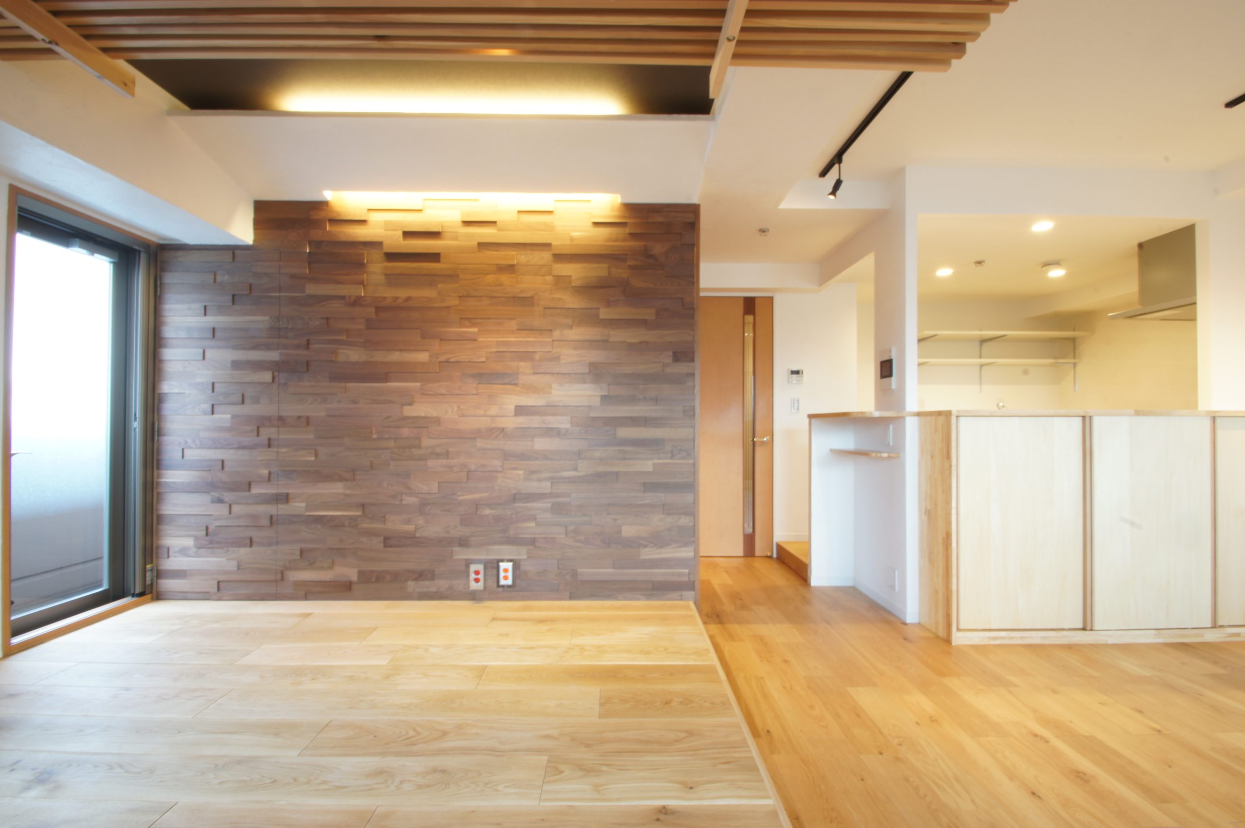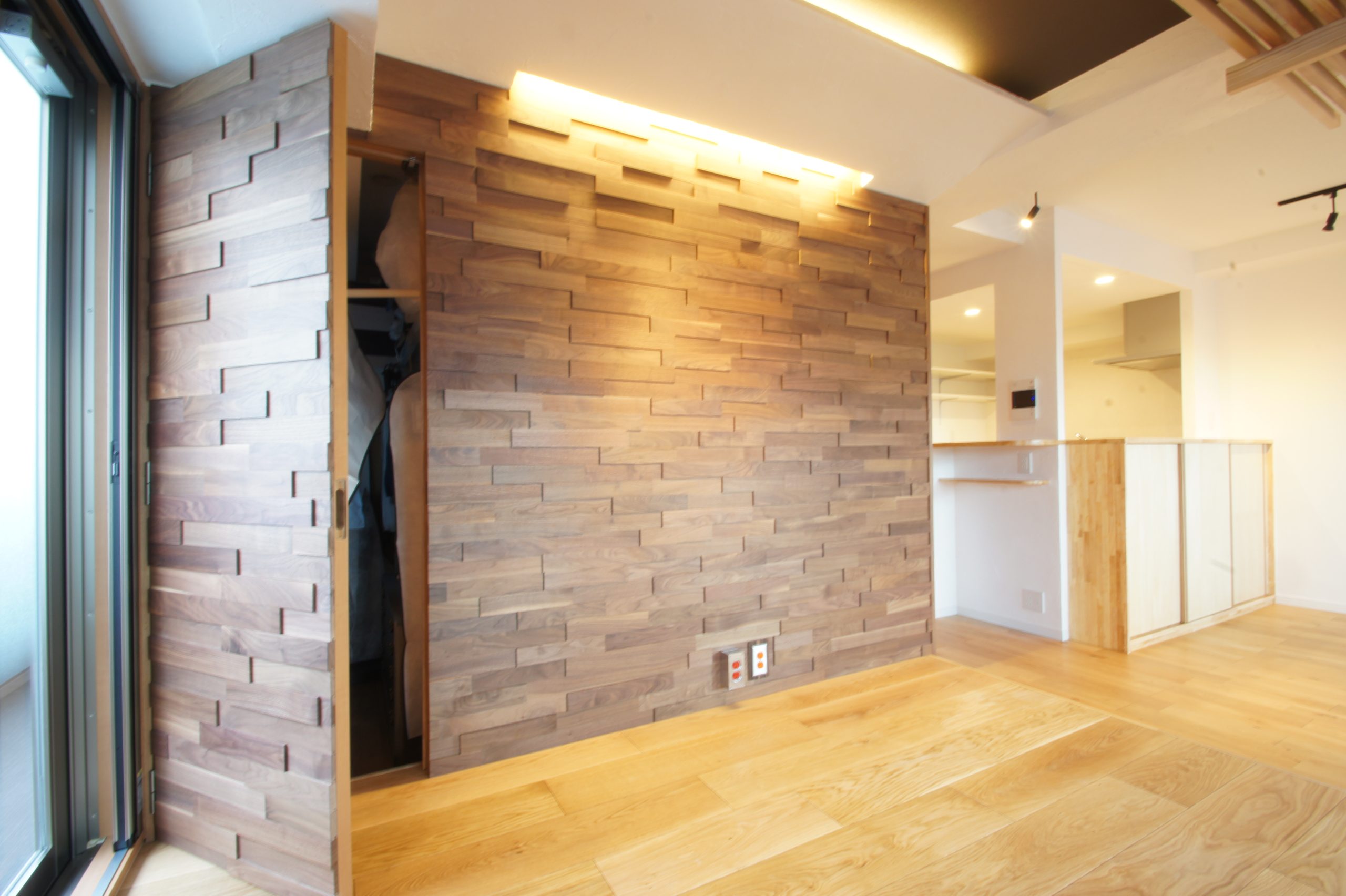 立建がリノベーションをさせていただいた音楽を愛するオーナー様のマンション。音質を上げるためウォールナットの木片を一枚一枚手仕事で張って厚みをだした壁。