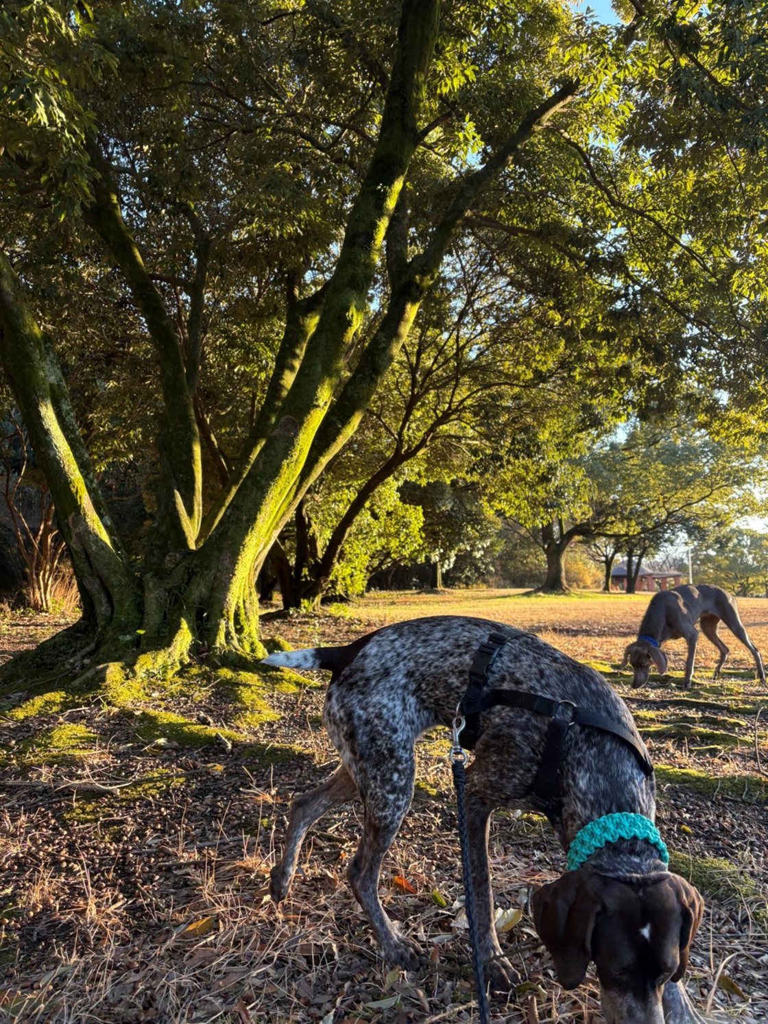 寒くても散歩へ行くと元気いっぱいアーデル&ハリー。美しく苔むす大樹を見てほしいのにクン活で見向きもしないダメモデル達( 一一)