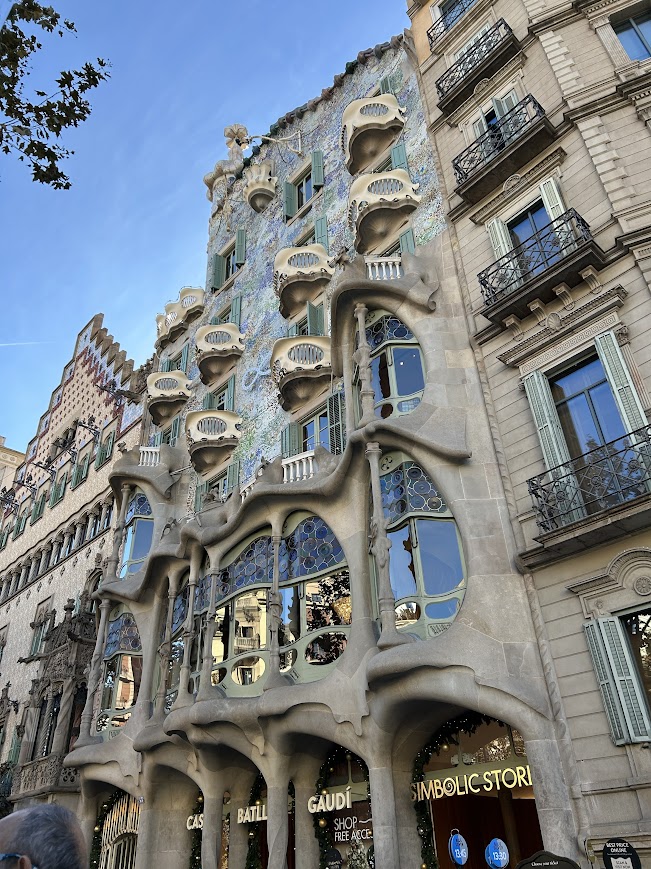 ガウディが改築をおこなった邸宅【カサ・バトリョ】建物に6階と地下室を加え、玄関空間の拡張、階段や内壁のつくりかえなどがされました。色鮮やかなモザイクタイル装飾や曲線が印象的な外観。骨の家、マスクの家、妖精の家、ドラゴンの家など、ユニークな別名をもつカサ・バトリョですが、内部空間がすごい!ぜひ検索してみてください( ^)o(^ )