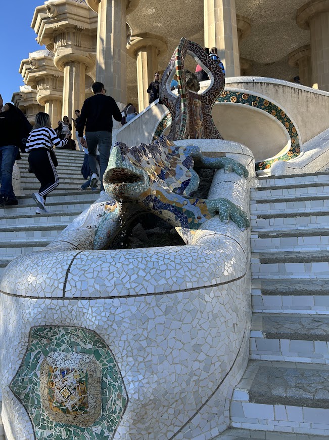 【グエル公園】大階段にある公園のシンボルのトカゲ。カラフルな装飾はガウディが好んで用いた手法、割れた陶器や余ったタイルを破砕しモザイク状に敷き詰める[トレンカディス]