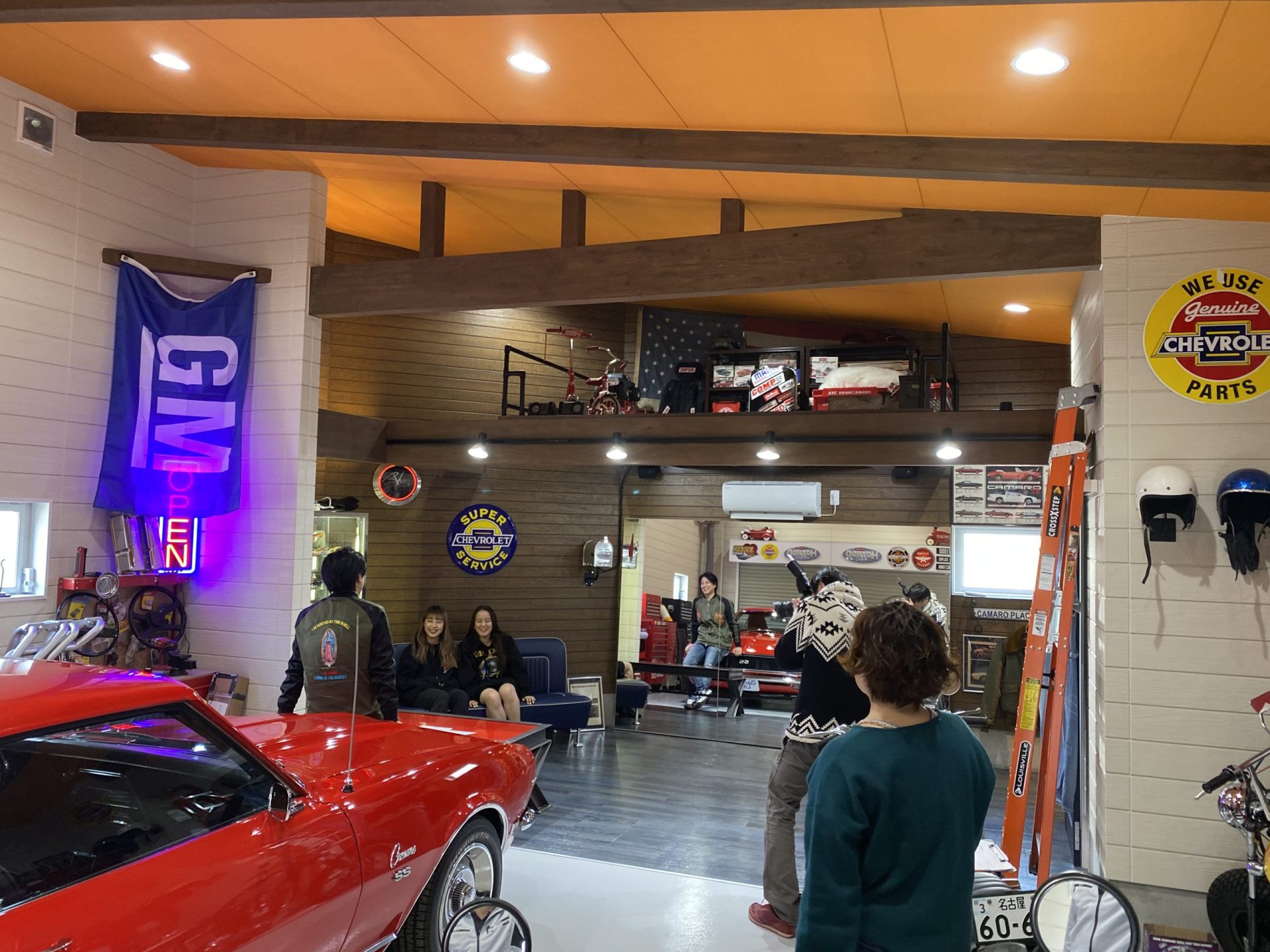 鮮やかなオレンジの天井のT様邸ガレージハウス。シャープな梁がカマロの曲線美を引き立てます。