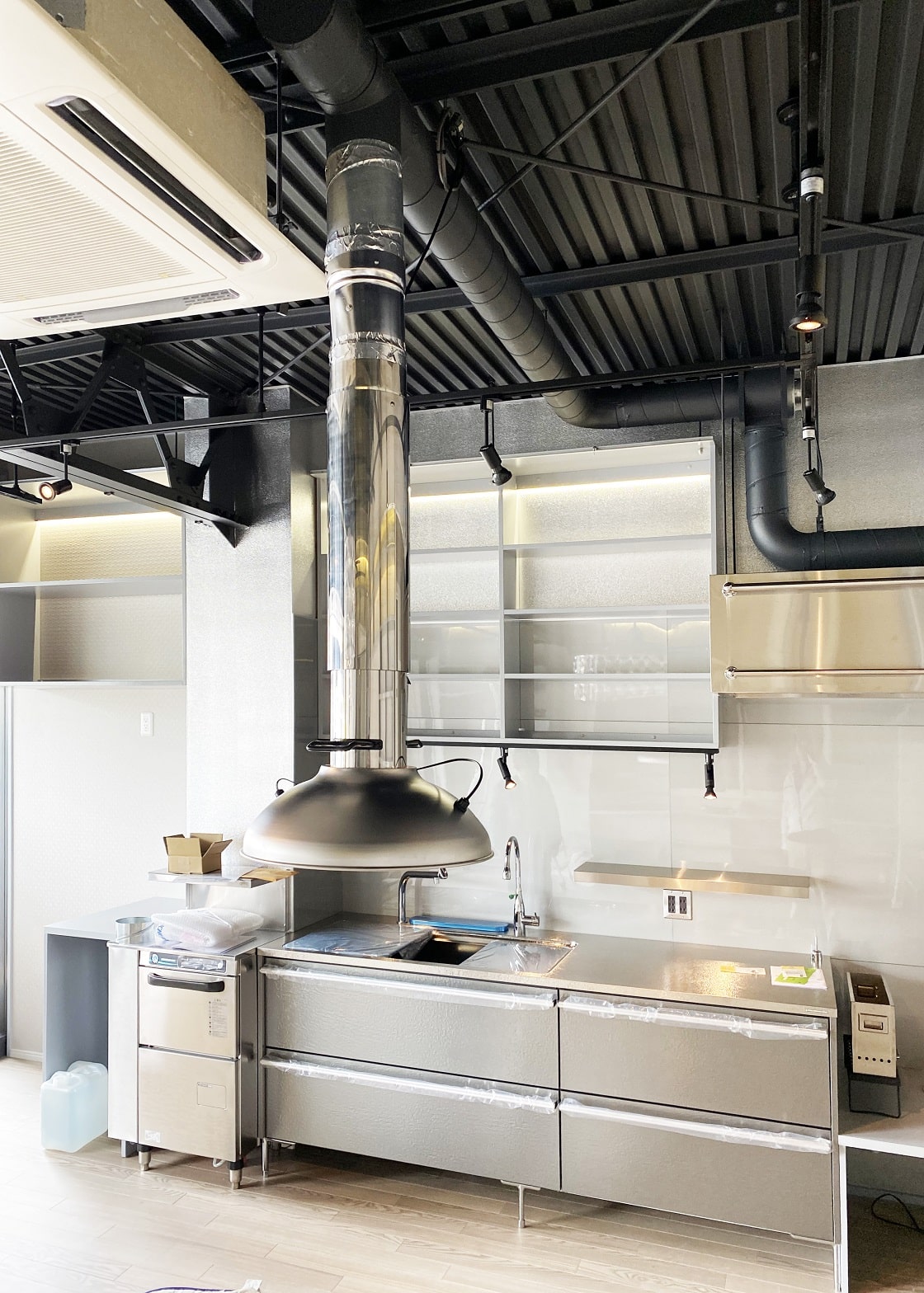 煙や匂いが気になり家の中ではためらうBBQですが、こんな排煙フードがあったらやりたくなりません? まるで店舗のようなK様邸キッチン。