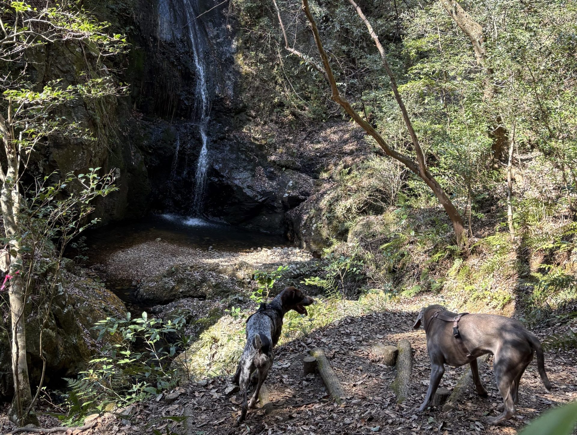 汗ばむ陽気の中、犬山八曽山へ行ってきました。木々の角度でなかなかの傾斜であることを感じていただけますでしょうか。遅れる私をアーデルが心配そうに見てます。ハリーは私の存在忘れてます(;^ω^)