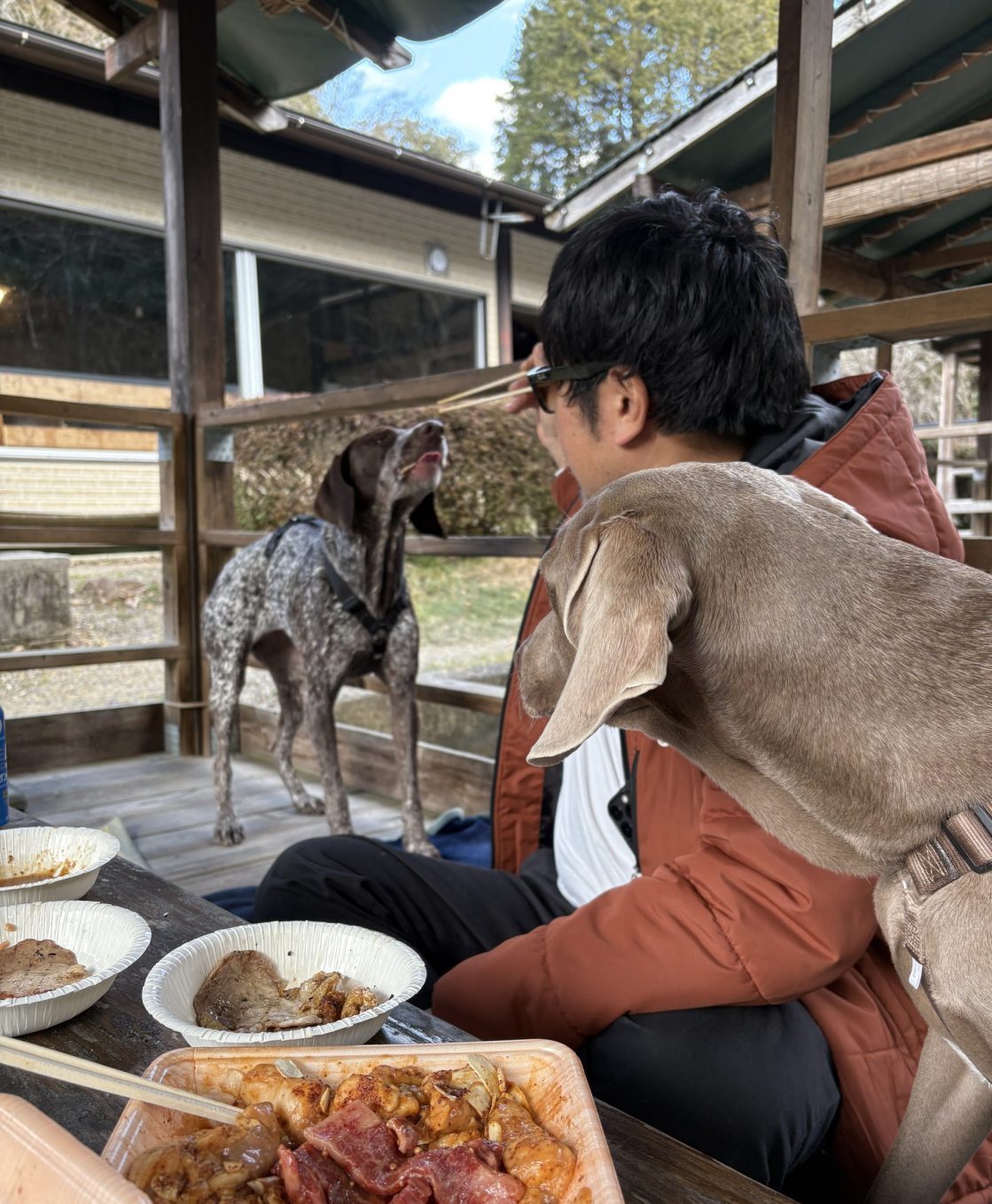 山歩きを楽しんだ(苦しんだ?)あとは大型犬も快く受け入れてくれるアウトドアベース・犬山キャンプ場さんの水上デッキでBBQ♪ 肢はぬぐって上がりますよ。アデハリもたくさんお肉をもらって大満足。
