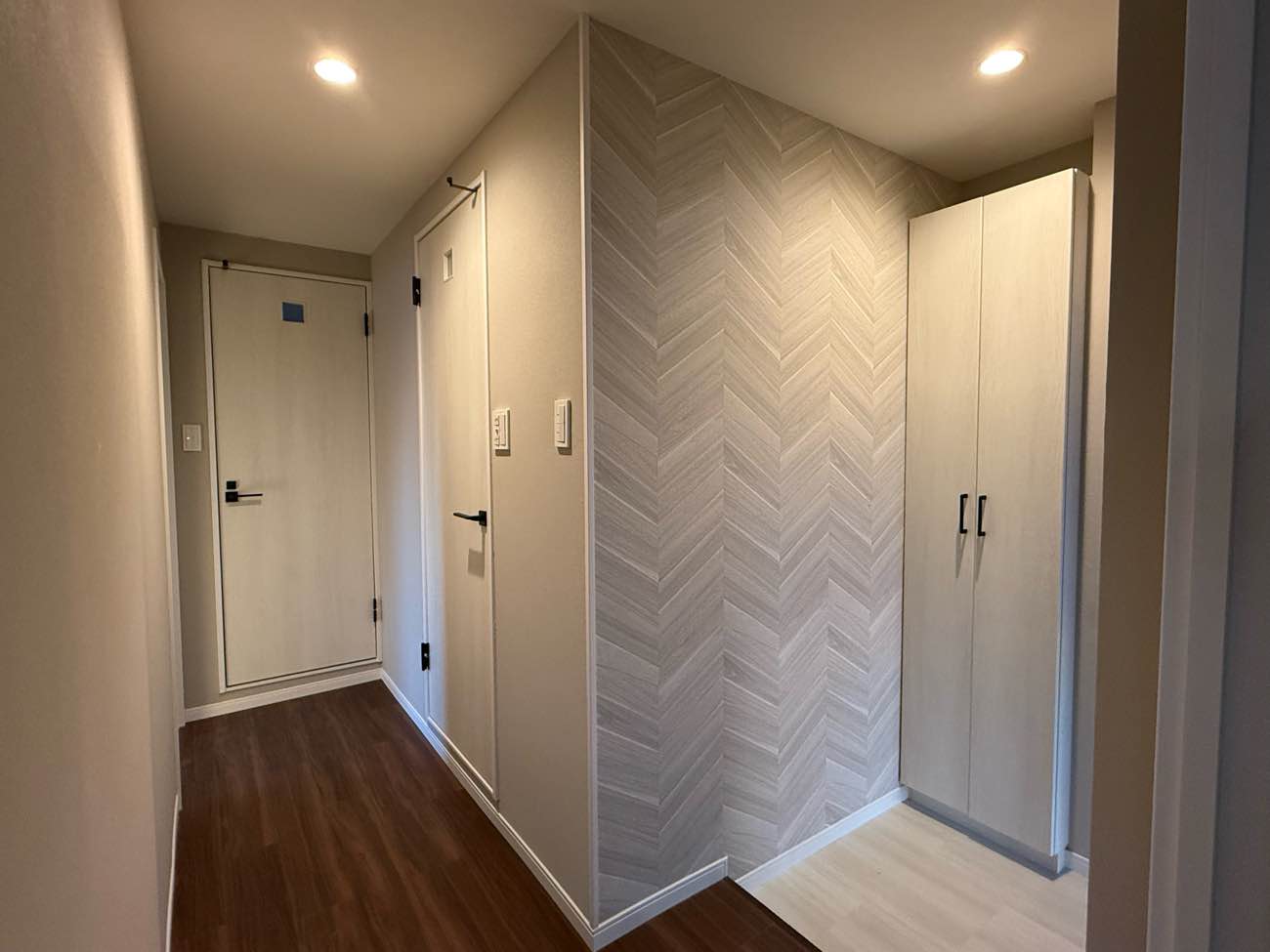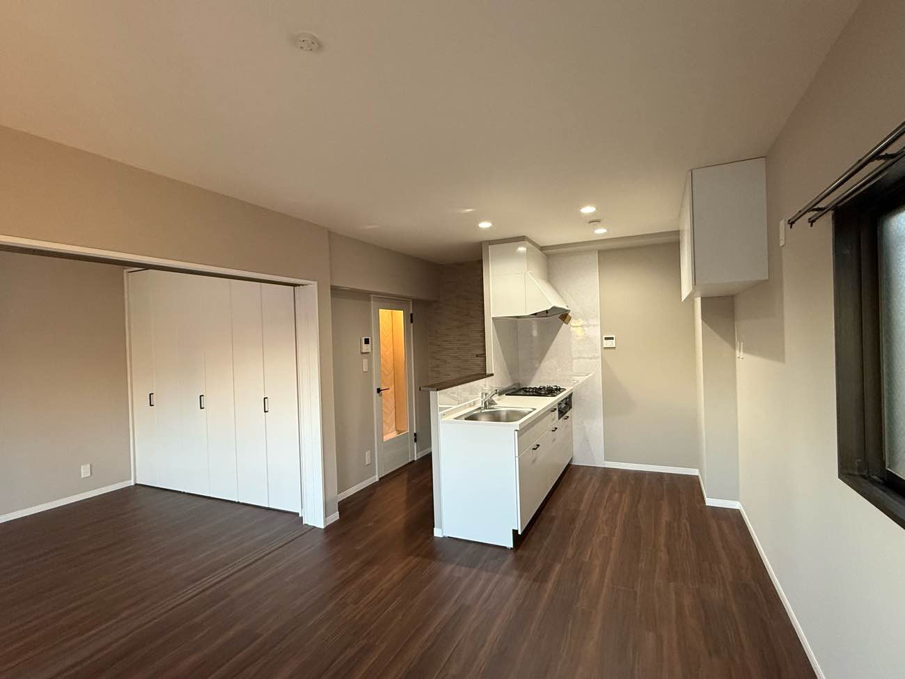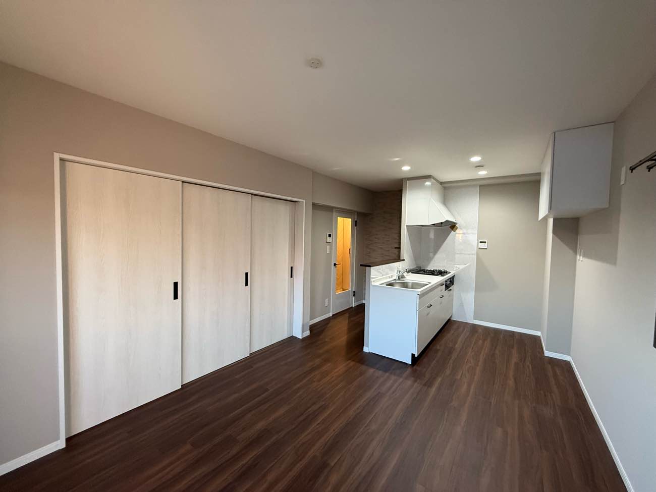 オーナー様必見。高稼働率の維持(空き室対策)と賃料単価アップにつながる費用対効果抜群のマンションリノベーションです。引き戸を開ければ大空間になるダイニングキッチン。壁付けだった古いキッチンはコンパクトながら使いやすい対面キッチンに。ウォルナット柄が美しいフロアタイルは、耐久性・防水性に優れ傷や汚れに強く賃貸マンションにおすすめの床材。ダイニングキッチン入り口2面の壁に貼ったエコカラットで機能性と高級感をプラス。玄関や洗面トイレのヘリンボーン柄が、アイボリーとダークブラウンでデザインされた空間のほどよいアクセントとなっています。