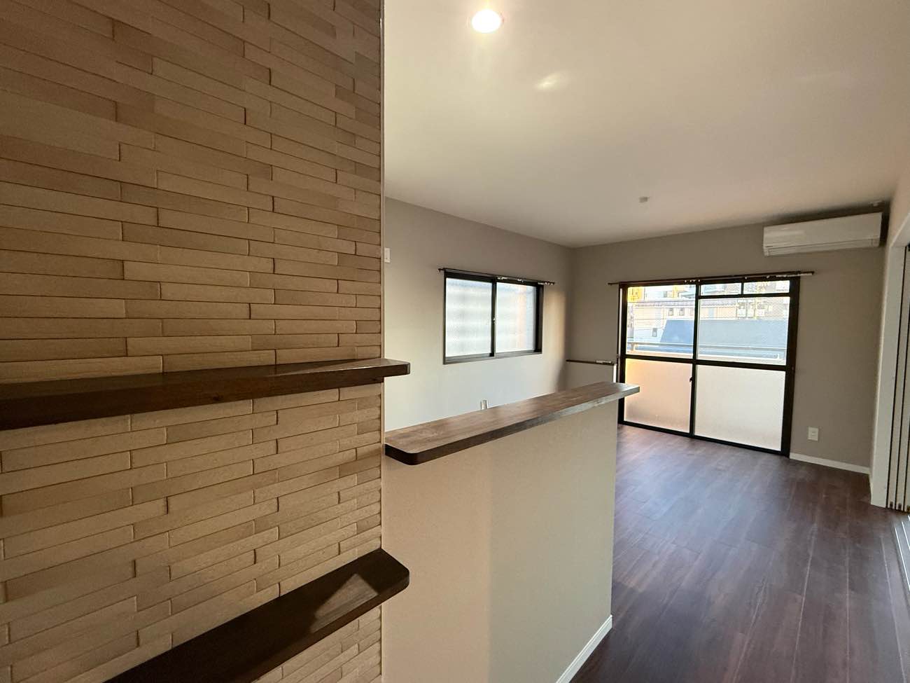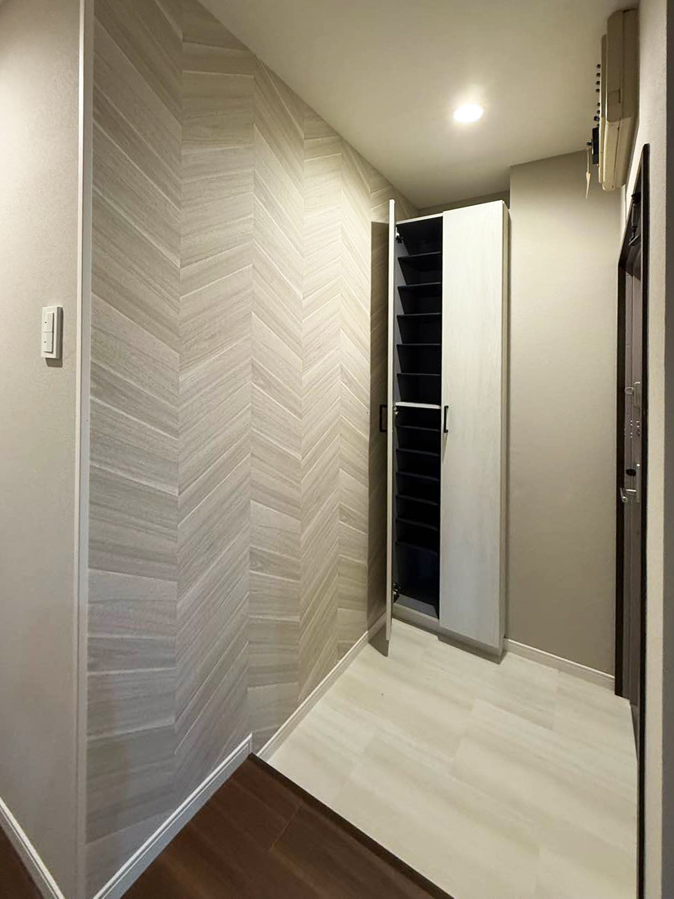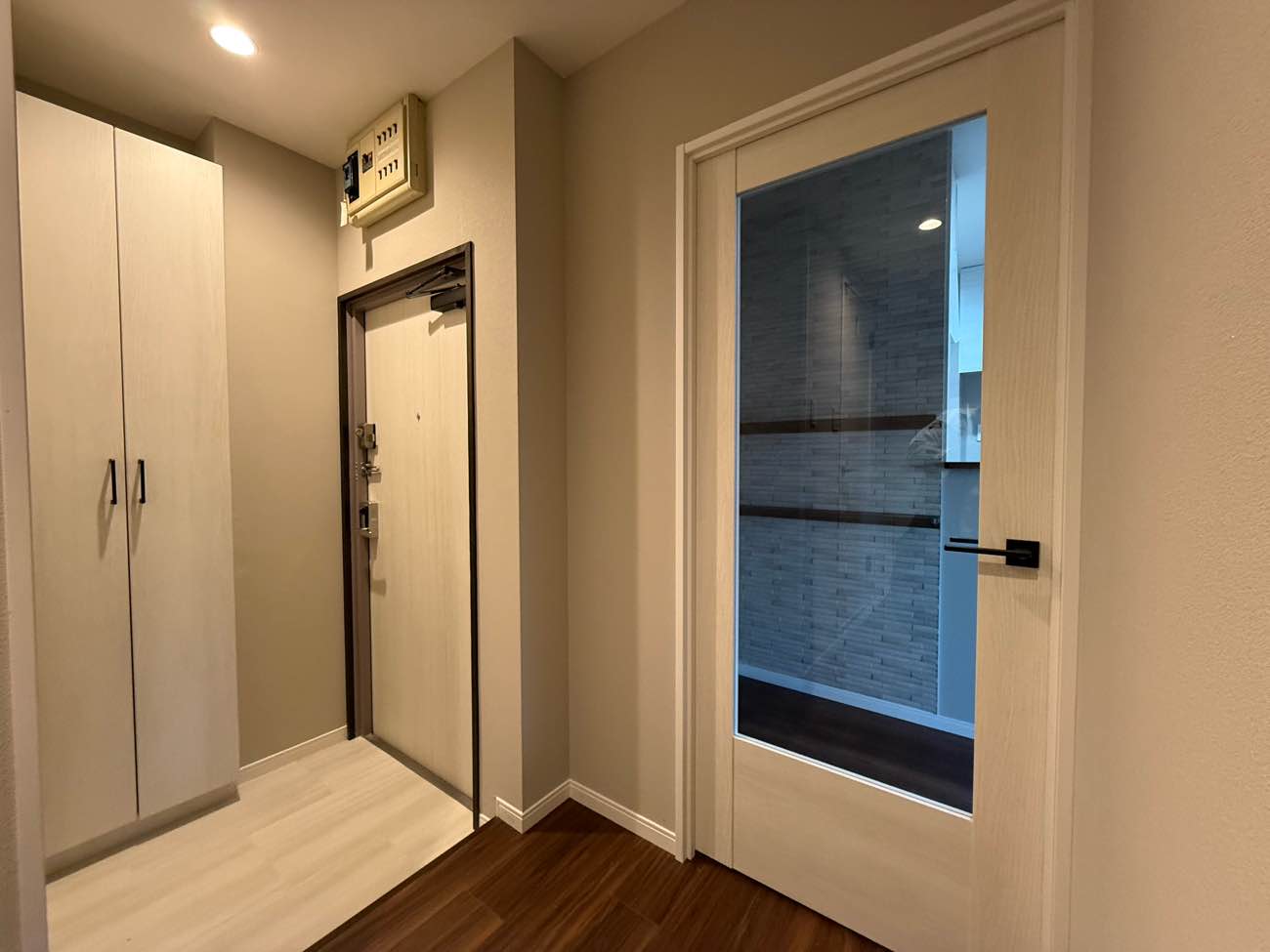 オーナー様必見。高稼働率の維持(空き室対策)と賃料単価アップにつながる費用対効果抜群のマンションリノベーションです。引き戸を開ければ大空間になるダイニングキッチン。壁付けだった古いキッチンはコンパクトながら使いやすい対面キッチンに。ウォルナット柄が美しいフロアタイルは、耐久性・防水性に優れ傷や汚れに強く賃貸マンションにおすすめの床材。ダイニングキッチン入り口2面の壁に貼ったエコカラットで機能性と高級感をプラス。玄関や洗面トイレのヘリンボーン柄が、アイボリーとダークブラウンでデザインされた空間のほどよいアクセントとなっています。